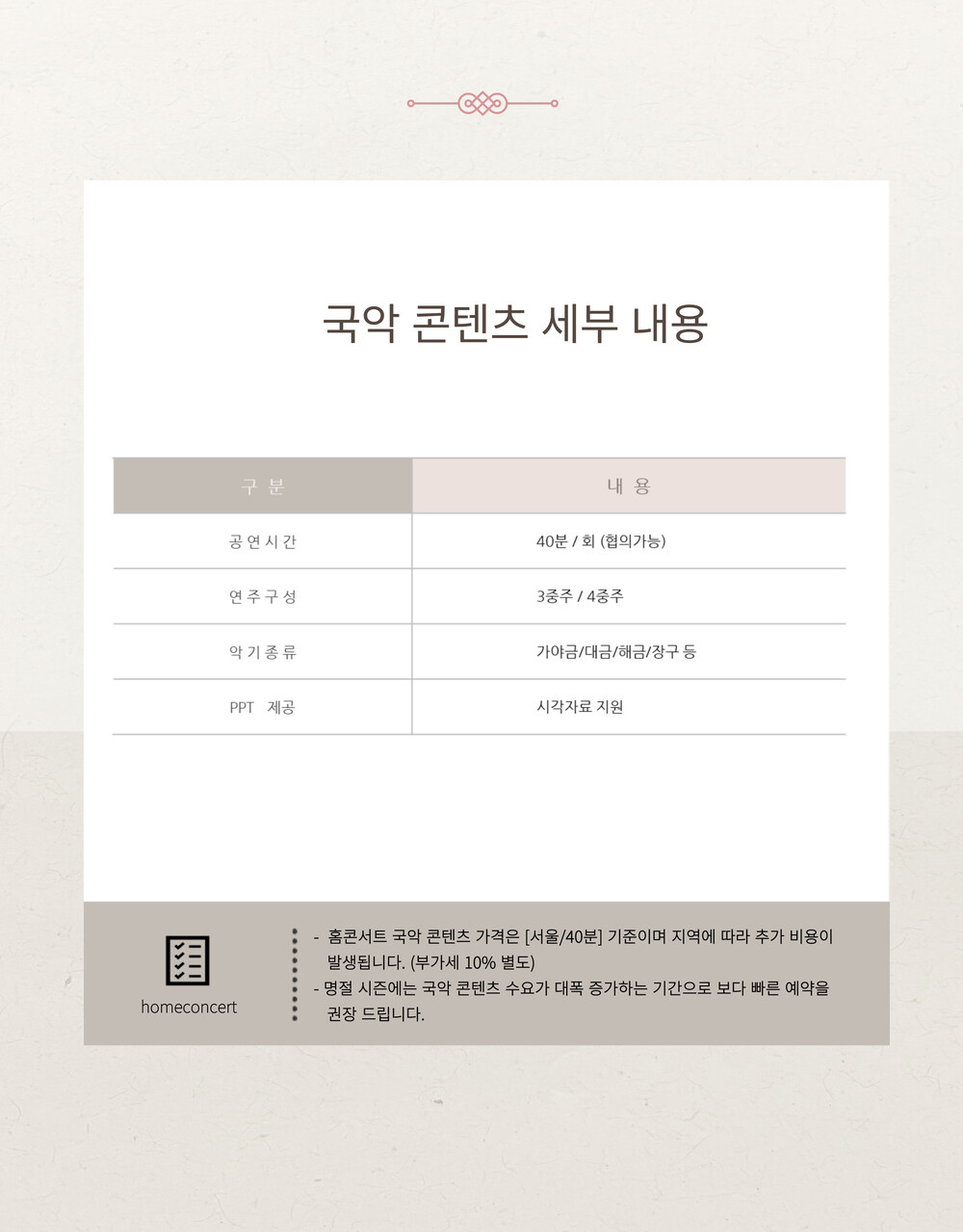 콘텐츠 가격 ㅣ서울/ 3중주/ 40분 기준이며 지역과 선택사항에 따라 추가 비용이 발생됩니다.(부가세 10% 별도)
